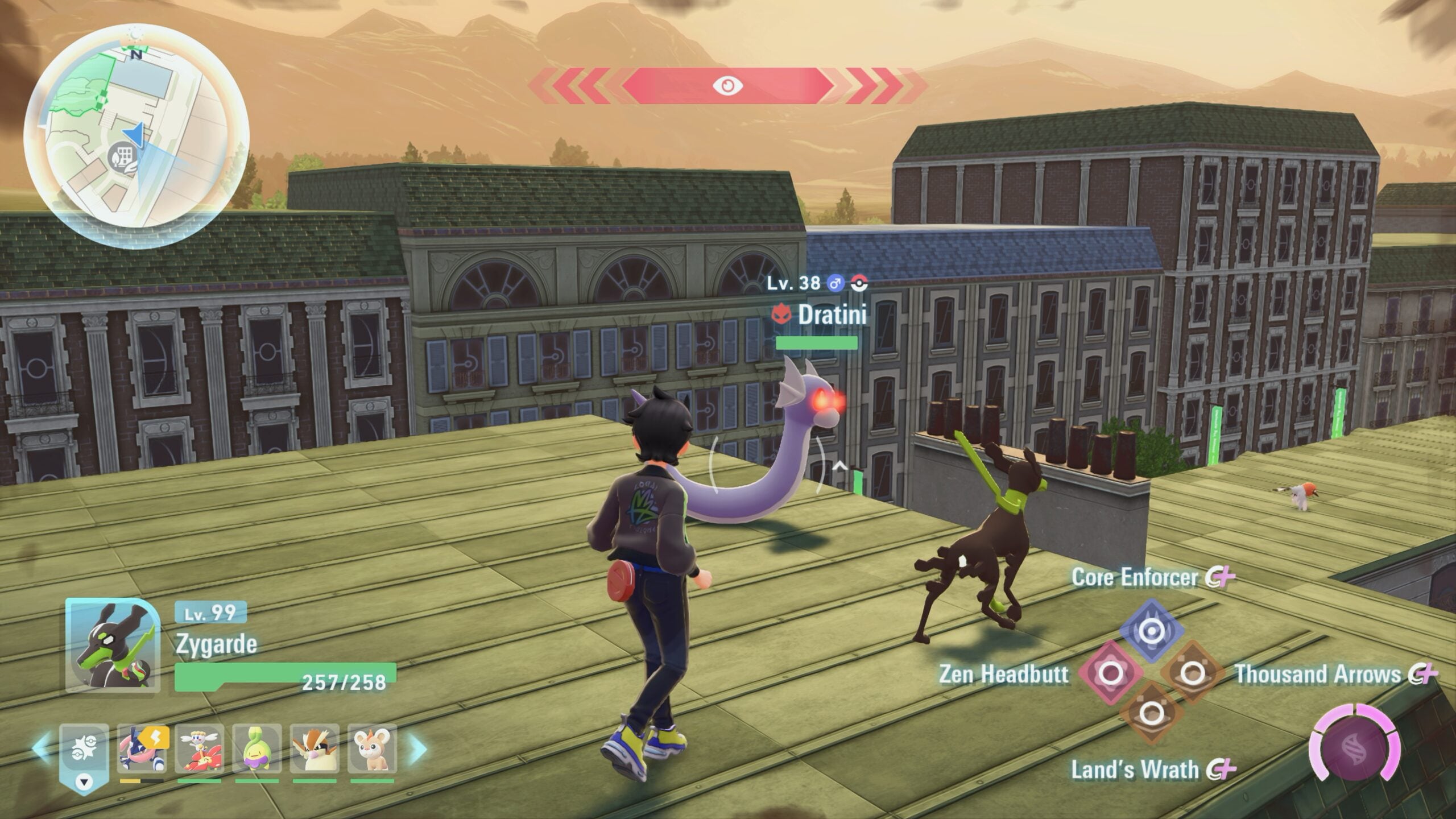 Dratini’s location can be found on other rooftops, too. One consistent spot is near the Jaune Plaza, which also doubles as Wild Zone 8. Head to Jaune Sector 3, and make your way up to the roof you can see in the image below.