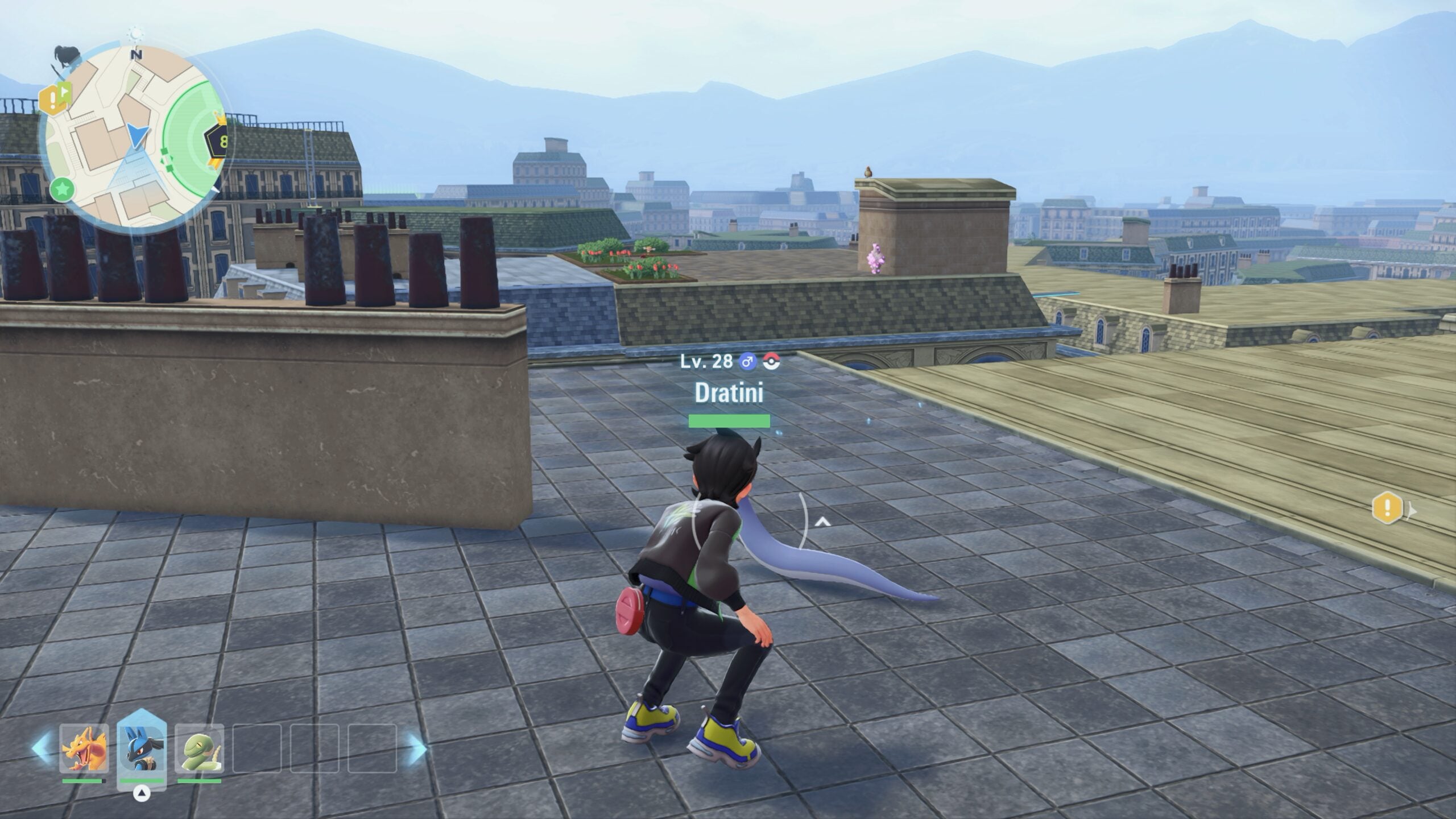 To find it, fast travel to Restaurant Le Nah, and then turn around. You’ll see a ladder that will take you up to a rooftop. Turn around and you’ll see Dratini sitting on the roof of the restaurant. Roll/glide your way to the roof, but make sure not to engage the Pokémon, as it may flee.