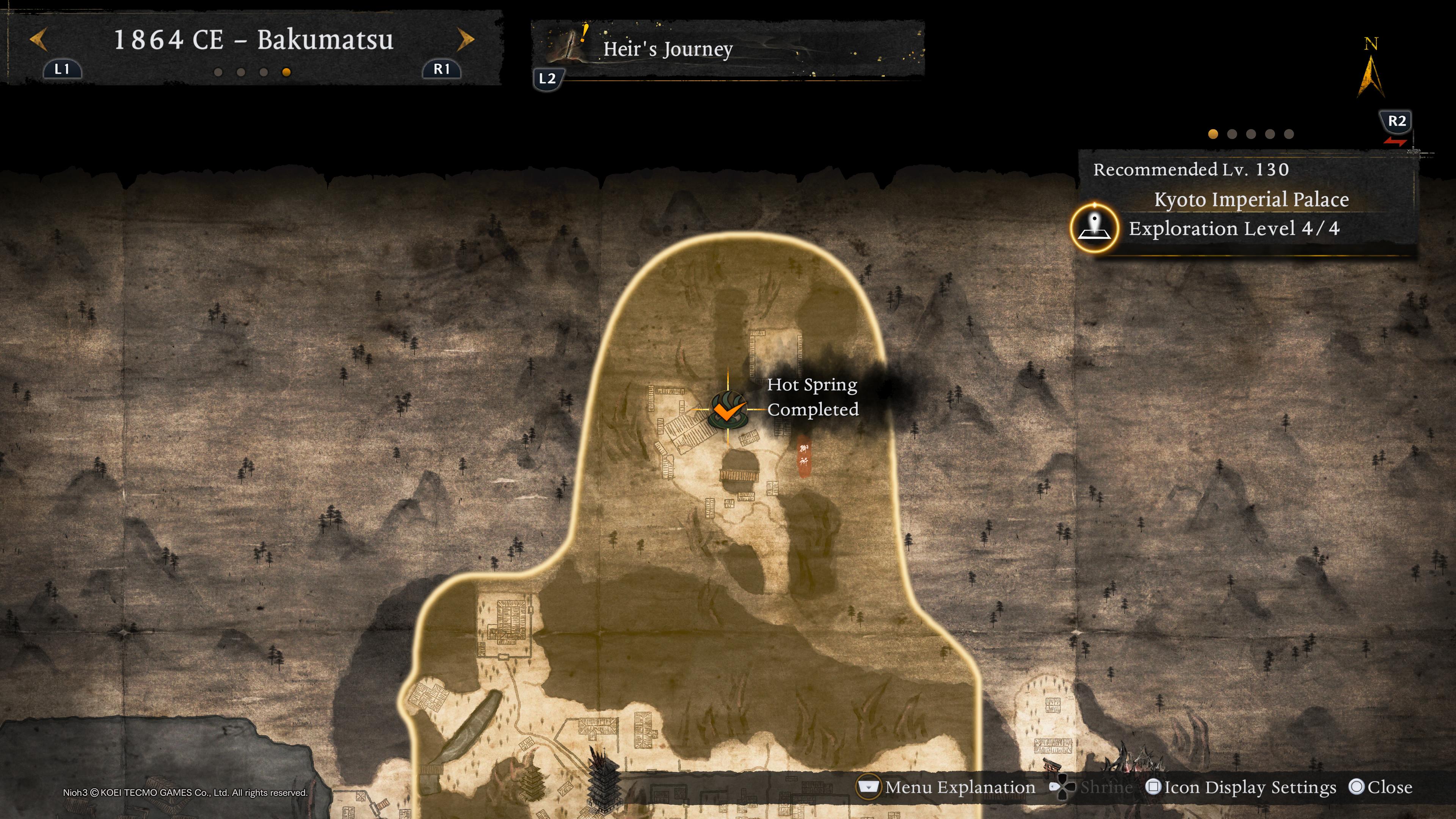 Finally, there’s a Hot Spring to find behind a Nurikabe in the Palace Grounds. If you miss this the first time, you’ll need to replay the Frozen City, Blazing Tree Battle Scroll from a Shrine to return to the area.