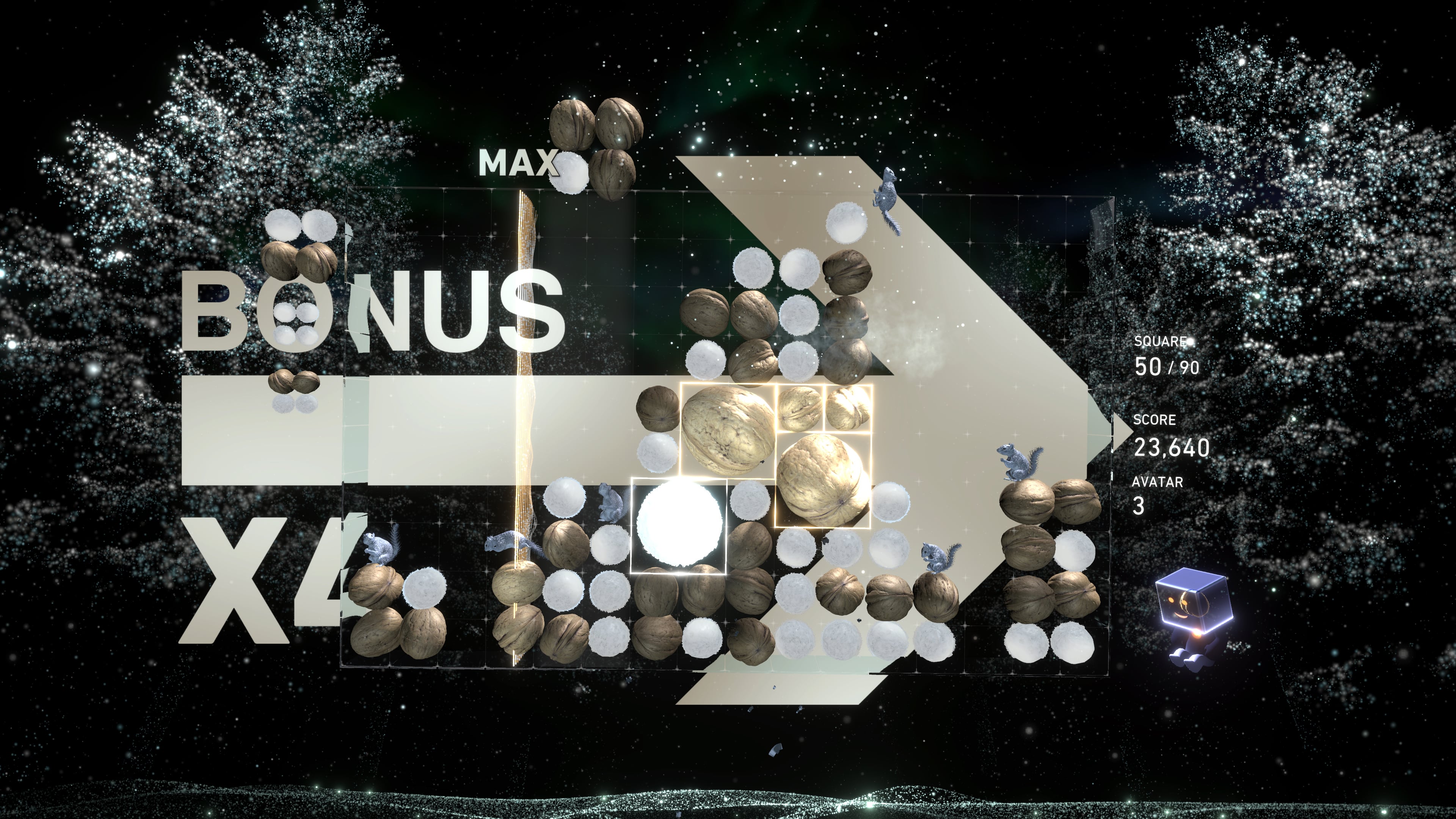 While it never outright spoiled the experience, frequently during my time with Lumines Arise, the visual furniture distracted from the gameplay in some way, either by decreasing the readability of the blocks or by outright obstructing them from view. Arise’s version of Effect’s Zone mechanic, called Burst, also often causes dozens of other player avatars to drop onto the field. Thankfully, many of these elements can be toned down in the settings, but some larger dynamic items cannot.